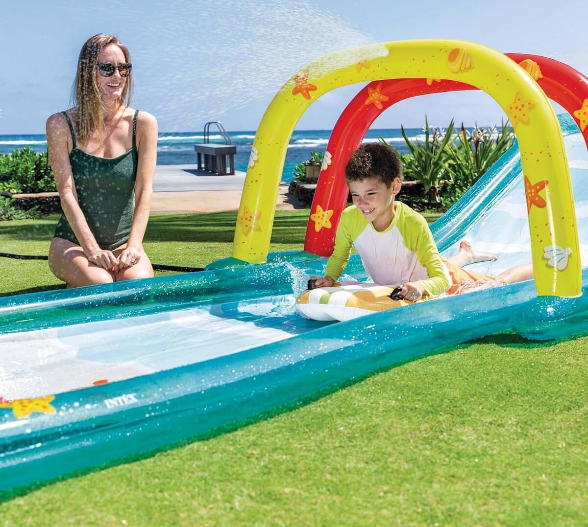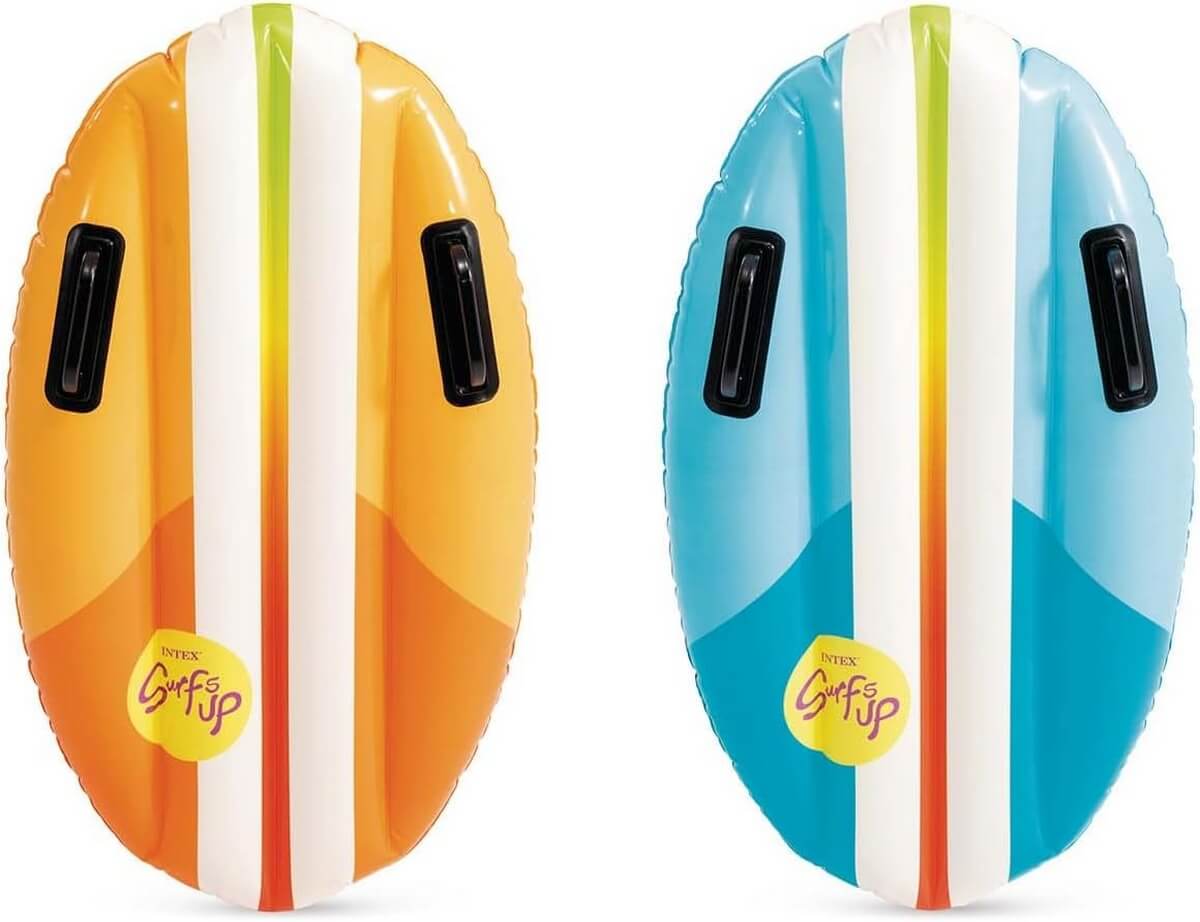 Надувная горка "SURFING FUN SLIDE" Intex 56167 предназначена для детей от 6 лет. Она оформлена в виде маленького пляжа и комплектуется 2 серф-досками. Эти доски оснащены удобными ручками, за которые можно держаться во время спуска.